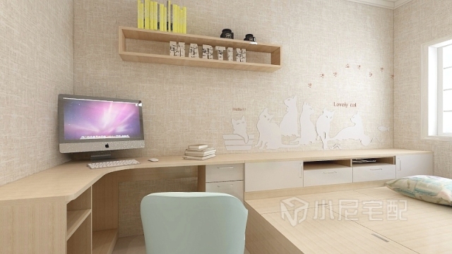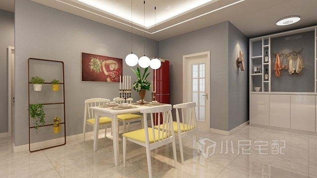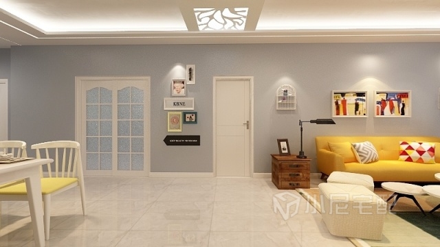 霧藍色的墻面遇見暖暖的黃色燈光,碰撞出不一般的顏色。