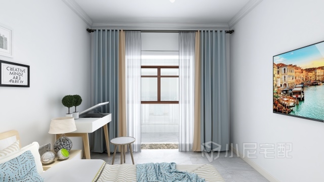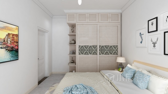 主臥室進(jìn)門處放個(gè)圓角衣柜,進(jìn)門顯得舒適,配合原木色床套整個(gè)屋子一切簡潔為主
