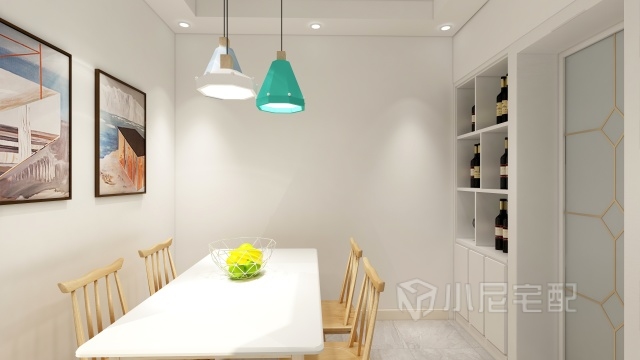 餐廳用酒柜及推拉門巧妙把衛(wèi)生間門和廚房門隱藏起來,使整個(gè)餐廳成為一體