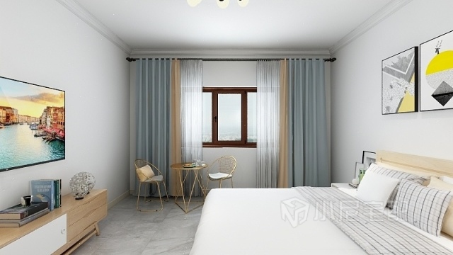 次臥室空間較大,放置轉(zhuǎn)角衣柜配合原木色床,使空間顯得緊湊而又不擁擠,窗臺(tái)邊放個(gè)休閑椅,盡享午后陽光