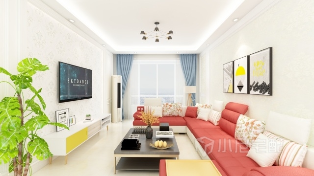 兩口之家,要求現(xiàn)代簡約,硬裝部分為白色石膏加壁紙搭配,彩色的沙發(fā)為空間增添一絲色彩。