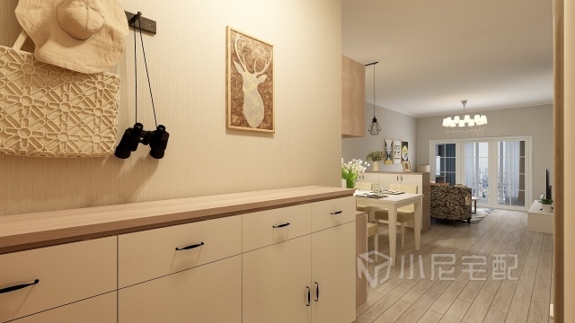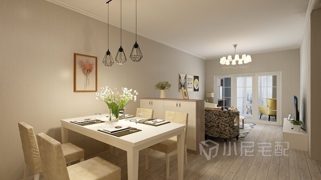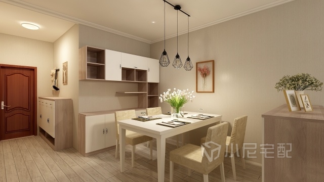 半高柜將餐廳和客廳分隔開,增加收納空間,同時(shí)統(tǒng)一風(fēng)格