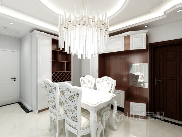 客廳選用的是簡(jiǎn)歐設(shè)計(jì),使用深胡桃柜體和白木紋門(mén)板套色,門(mén)廳鞋柜和餐邊柜