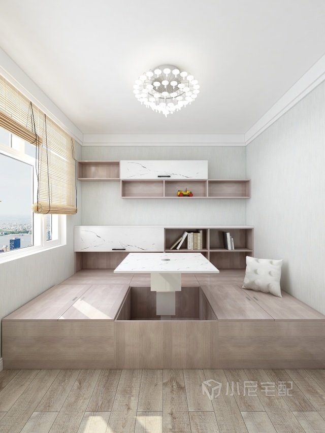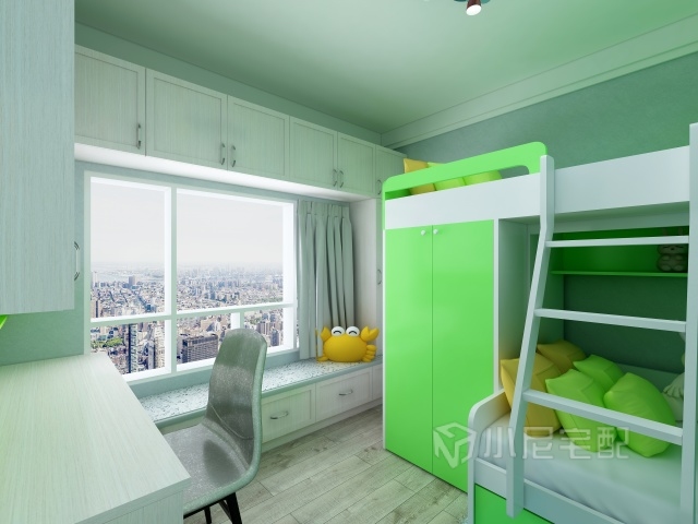 兒童房做了一個(gè)飄窗柜,飄窗柜和寫(xiě)字桌連接。