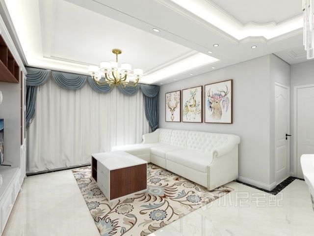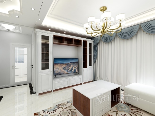 客廳選用的是簡(jiǎn)歐設(shè)計(jì),使用深胡桃柜體和白木紋門(mén)板套色