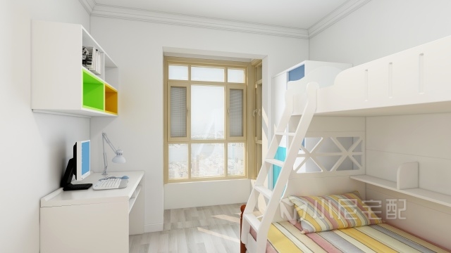 兒童房放置上下床節(jié)約空間,套色書桌配合藍白衣柜,給孩子一個多彩的空間