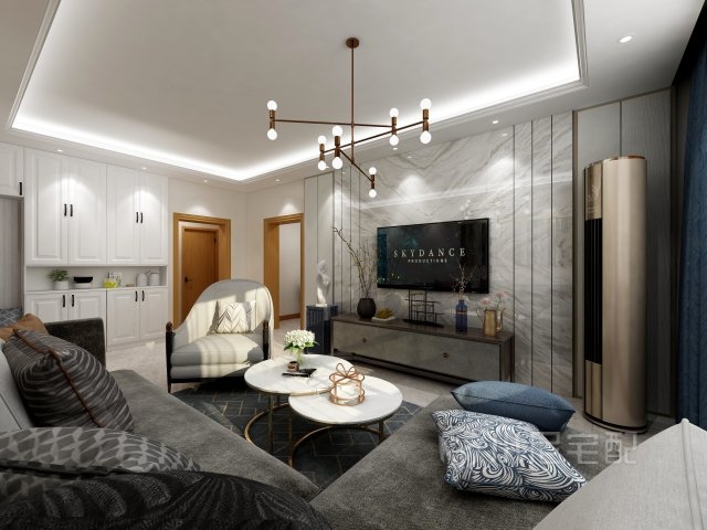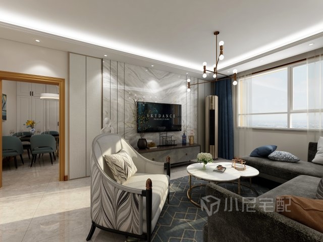 客廳的電視墻使用石材與硬包裝飾,再增加豎線條的點綴,從質(zhì)感到造型都使空間豐富又不失內(nèi)涵。