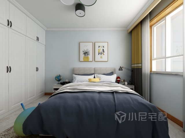 藍灰色的墻面給人感覺清爽舒適,姜黃色的窗簾更加增添了活躍的氣氛