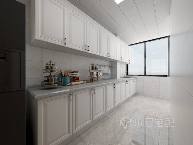 廚房算是狹長型的,用白色的櫥柜增加明亮度。