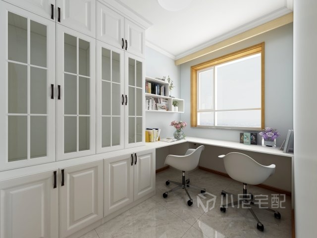 書房的空間比較緊湊,白色的書柜簡潔溫馨,使人能安靜下來,