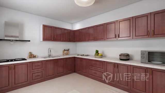 廚房作為獨立空間使用了業(yè)主偏愛的紅色,L形的櫥柜滿足了使用上的要求