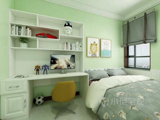 綠草色的墻面,搭配白色的書桌,卡通式的掛畫,我就問你美不美