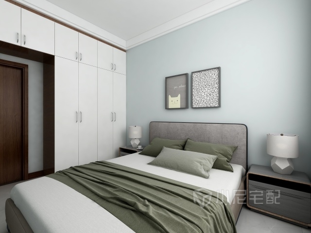選用象牙墻面選用灰色被子,灰色的床,經(jīng)典的灰白搭配,低調(diào),沉穩(wěn),大方