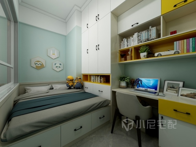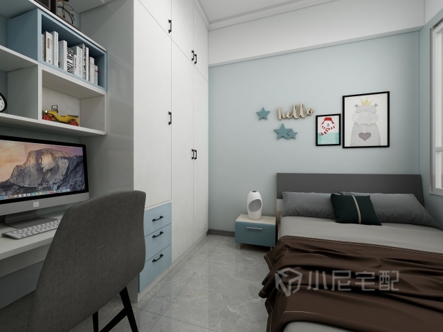我我們?cè)賮砜纯磁P室,臥室里里面的白色頂面與深木色地面有著“天輕地重”的舒適視覺感,墻面涂裝了淡淡的淺灰色,與白色吊頂拼接的相得益彰很舒適、溫和,并在床頭左右上方安裝黑色壁燈,讓墻面裝飾效果形成黑白對(duì)比的層次美感。深棕色木質(zhì)雙人床+床頭柜+邊幾,顏色深重與木地板相呼應(yīng),用淺色鈷藍(lán)+白色床品來裝點(diǎn)。白色的臥室衣柜嵌入式設(shè)計(jì)在淺灰色墻面內(nèi),三柜一體設(shè)計(jì)簡(jiǎn)單而直接,力求功能、實(shí)用。衣柜旁邊的淺灰色墻面用一幅現(xiàn)代掛畫來裝點(diǎn)便已足夠,盡顯臥室空間的干凈與舒適。