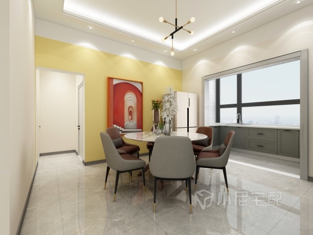 這是餐廳,可以看出餐廳裝修手法延續(xù)了客廳的手法,每一處都充滿著簡(jiǎn)約時(shí)尚的氣息。一側(cè)墻面設(shè)計(jì)了一整排簡(jiǎn)潔干脆的墻柜,充分將收納功能做到最大。對(duì)墻面用規(guī)格相同的木框掛畫來裝點(diǎn)綴飾,很好的避免了白色墻面的單調(diào)感,左右墻面整體上看很是豐富、自然,且符合現(xiàn)代簡(jiǎn)約風(fēng)格的裝飾特點(diǎn)。六人座的餐桌椅是采用實(shí)木+玻璃材質(zhì),現(xiàn)代質(zhì)感極佳,在玻璃桌面上擺上一大束跳舞蘭,豐富空間顏色的同時(shí)還帶來了幾分活潑之感,讓人的心情倍感愉快。上方兩盞黑色金屬吊燈有種工業(yè)風(fēng)的味道,正好和玻璃材質(zhì)的裝飾韻味很相搭,給人一種協(xié)調(diào)的美感。
