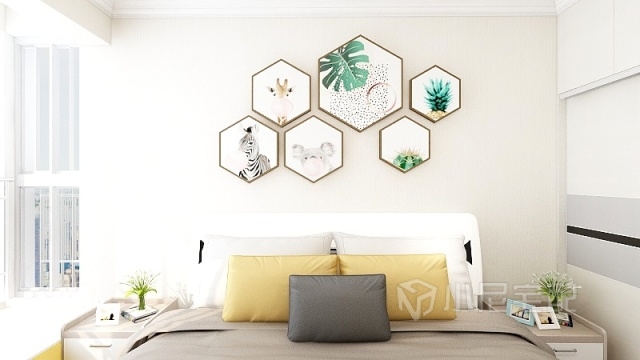 主臥室采用白色床頭,配合綠植掛畫,清晰自然