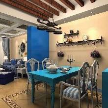 地中海風格的靈魂就是“蔚藍色的浪漫情懷,海天一色、艷陽高照的純美自然”。設(shè)計中添加咖色以中和色調(diào),爛漫中不失沉穩(wěn)