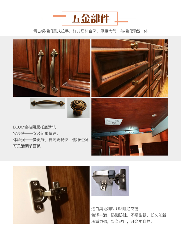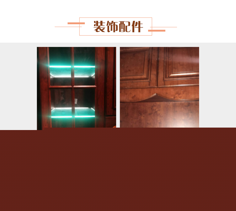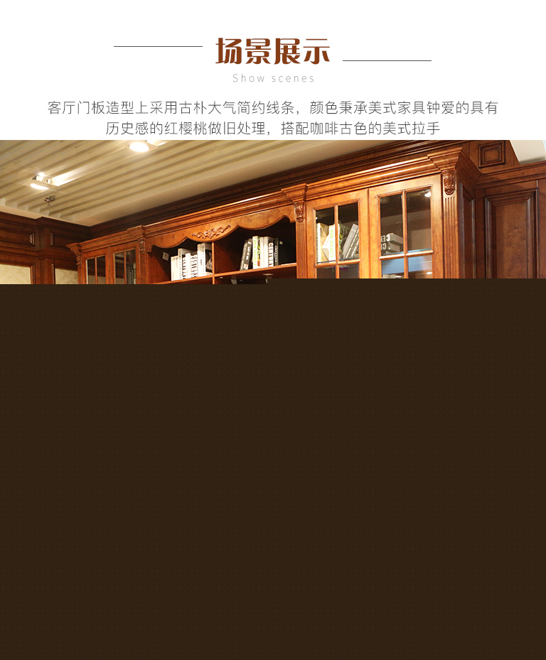 | 細節(jié)描述 | 客廳門板造型上采用古樸大氣簡約線條,顏色秉承美式家具鐘愛的具有歷史感的紅櫻桃做舊處理,搭配咖啡古色的美式拉手。注重黃金比例設計,巧妙的柜體結構形成對稱,強調(diào)家具帶給人的平和感,并且把現(xiàn)代的功能納入其中,裝飾效果好,穩(wěn)定性強,儲物更加方便。 |