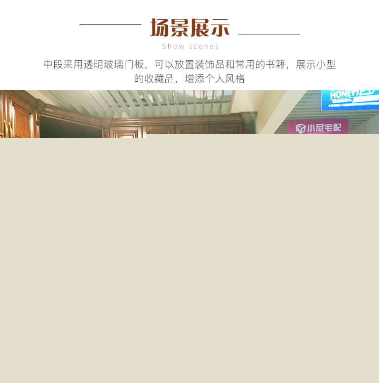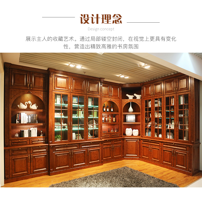書(shū)房中段采用透明玻璃門(mén)板,可以放置裝飾品和常用的書(shū)籍,展示小型的收藏品,增添個(gè)人風(fēng)格。下方用門(mén)板柜子,將雜物完整收納干凈。兩側(cè)的開(kāi)放柜可以展示自己的收藏品和藝術(shù)畫(huà),展示功能強(qiáng)大。局部開(kāi)放,局部鏤空封閉,在視覺(jué)上更具有變化性,營(yíng)造出精致高雅的書(shū)房氛圍。