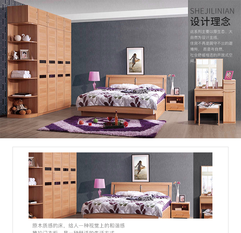 | 規(guī)格 | 床頭柜:460*400*394mm 床:2170×1870×1000mm 推拉衣柜:2200×600×2700mm 梳妝臺:828×400×1422mm 梳妝登:400×300×400mm 普通加強床墊:1800×2000×200mm |